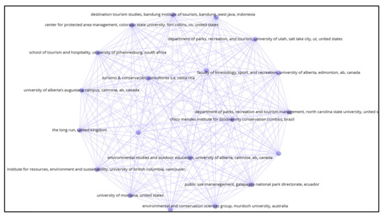 Figure 12 represents a collaboration network of 20 organizations, determined on the basis of their co-authored publications. In all, 5 out of 20 organizations in the network are in the USA; 4 are in Canada; and 1 each is in Brazil, Indonesia, Australia, Germany, Ecuador, New Zealand, South Africa, Kenya, the UK, Costa Rica, and Croatia.