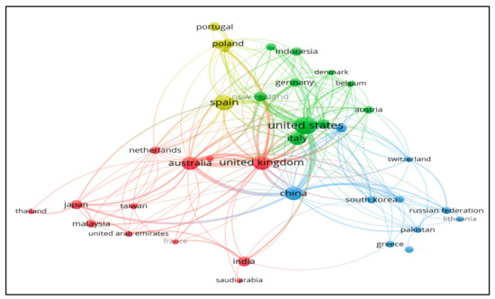 A co-authorship network of 37 countries is presented in Figure 13. There are four clusters of countries’ collaboration: red cluster (12 countries), green cluster (10 countries), blue cluster (10 countries), and yellow cluster (5 countries). Based on co-authorship, the most important countries in the green cluster are the US, Italy, New Zealand, Germany, and Indonesia. Meanwhile, Spain, Poland, and Portugal are the key countries in the yellow cluster; the UK, Australia, India, and the Netherlands are in the red cluster; and China, South Korea, and the Russian Federation are in blue cluster. The strongest collaboration in the network was observed among China, Australia, UK, US, and Japan.