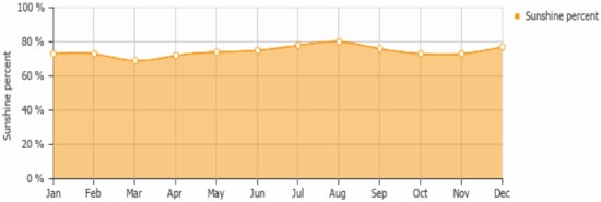 - Weather and Climate. Average Percent of Sunshine in Middelburg (Eastern Cape). n.d. Available online: https://weather-and-climate.com/average-monthly-percent-Sunshine,middelburg,South-Africa (accessed on 10 June 2022).