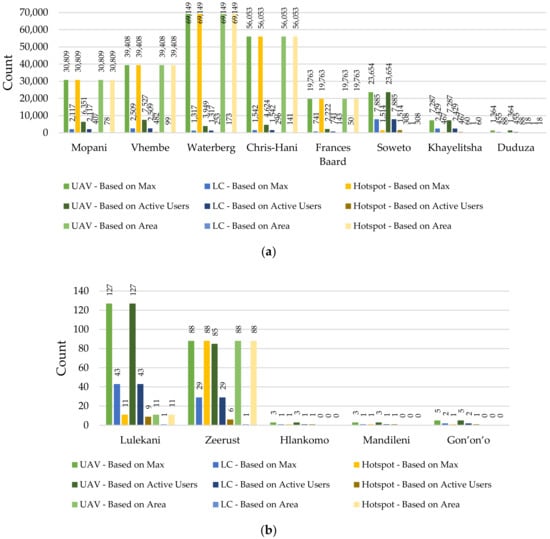 For the rural residential areas, a single LC-based solution can supply basic network services over most of the considered areas. Looking closer at these zones, Gon’on’o requires five UAVs, two LCs, or a single Hotspot-based cellular node to provide full coverage to the village, while Mandileni and Hlankomo require either three UAVs, one LC, or one Hotspot-based cell. Though Gon’on’o is a small residential area, it needs more nodes than the other rural residential areas because there are more people who live there.