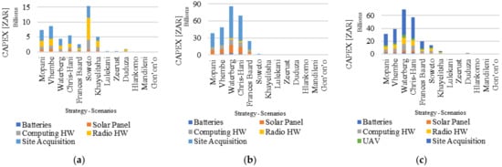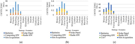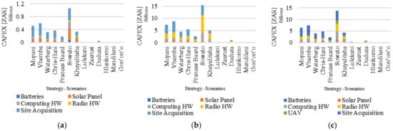 Figure 6a–c depict the total CAPEX computed based on the number of users for the 13 locations. Each graph shows the cost of each parameter needed to deploy a network in South African rands. Interestingly, in each scenario, the UAV-based and Hotspot-based solutions consistently require more CAPEX than the LC-based solution. Across the board, the most substantial contributors to the costs are site acquisition and computing/radio hardware (HW) expenses, while the UAVs, solar panels, and batteries have a lower impact on the CAPEX. Of the municipalities, Vhembe has the highest number of users and hence the higher CAPEX; similarly, due to their dense populations, Soweto and Khayelitsha townships required much more CAPEX than the other township areas.