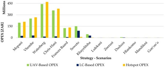 Figure 8 presents the expenditures of each scenario by showing the analysis for RAN. Like the first two cases, the UAV-based and Hotspot-based solutions need greater CAPEX compared to the LC-based. However, in this analysis, the size of the scenario has a greater impact on the CAPEX, with the expenditure being significantly higher for the district municipalities.