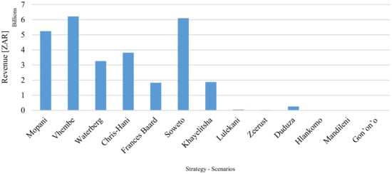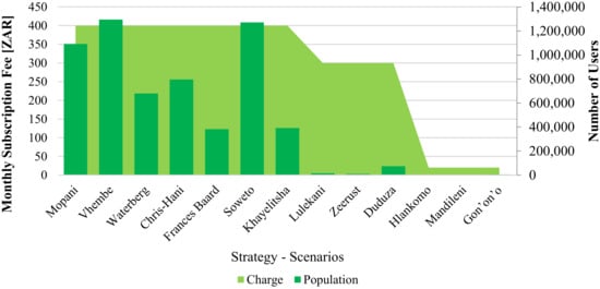 Figure 11 shows a line graph for the annual income of all network types. From a glance, all five district municipalities generate more revenue compared to rural residential areas and townships, while the France Baard region is the lowest producer, generating approximately ZAR 2b (USD 126 m) of income. Vhembe district municipality and Soweto township both have a vast population and as expected also have considerably higher revenue per year. Though Vhembe has the highest revenue, it is only marginally higher than Soweto, due to its lower average population density when compared to Soweto (see Table A2). Finally, for the rural residential areas, only about half a billion ZAR (USD 33 m) is attainable at most as revenue.