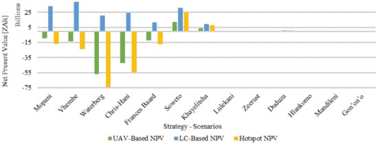 Interestingly, in each scenario, the LC-based solution with the proposed monthly subscription fee in Figure 10 yields a more profitable return than both the UAV- and Hotspot-based solutions. Hence, by using only UAV- and Hotspot-based solutions to supply 5G services to any district municipalities, the operator will not be able to recover the initial CAPEX. For instance, Waterberg region requires more than ZAR 55 B (USD 3.7 B) for both UAV- and Hotspot-based solutions to run until their lifetime expires, but it only generates about ZAR 3B (USD 200 m) (see Figure 11). In the case of Vhembe, due to its larger population compared to the other municipalities, it requires more SCs to fully supply coverage to the entire area and hence more expenditure. To this end, only the LC-based solution is more profitable in the district municipalities. On the contrary, the low-income and rural residential areas are profitable for all network type, with Soweto and Khayelitsha townships yielding the highest cash flows.