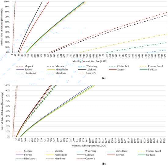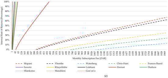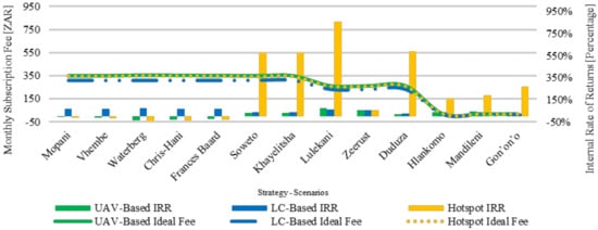 The graphs in Figure 13 depict IRR for the three model solutions being considered over the 13 ZA locations. The LC-based solutions (Figure 13a) would require users to pay close to a ZAR 1,860 (USD 127) monthly subscription fee to obtain at least 10% IRR across all locations. When UAVs are used, Figure 13c reveals that with about ZAR 200 (USD 13), an IRR of 10% can be obtained across all locations. Finally, the Hotspot-based solution (Figure 13b) would require users to pay almost ZAR 1838 (USD 116) for a 10% IRR. In essence, by using UAVs, with a monthly subscription fee of just ZAR 30 (USD 2), a 50% IRR can be obtained in the rural areas or ZAR 200 (USD 13) for profitability across all locations.
