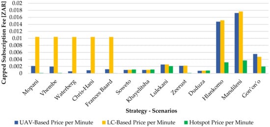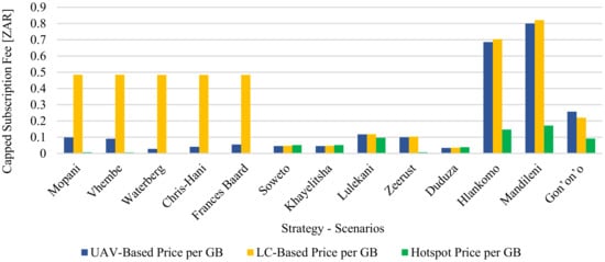 The graphs reveal that the rural residential areas of Hlankomo and Mandileni would pay the most for all network types and significantly more for the LC- and UAV-based solutions. On the contrary, the users in the township areas pay the least across all network types, while the municipalities are charged about an average of the rural and township prices. Despite these values, it is important to note that our average proposed price for all three network types (UAV-, LC-, and Hotspot-based network) is ZAR 0.50 (USD 0.031) for 1 GB of data bundles. Even at a peak rate of ZAR 0.80 (USD 0.05), our proposed hybrid network is still extremely cheaper compared to other TSP rates, such as Telkom, which charges ZAR 60.00 (USD 3.8) or Cell C with a rate of ZAR 75.66 (USD 4.8) for 1 GB of data bundles.