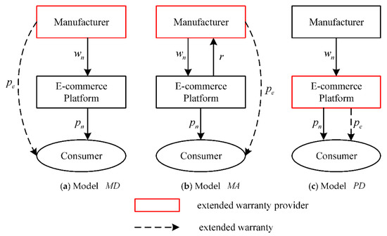 We consider an E-commerce supply chain consisting of a manufacturer (M) and an E-commerce platform (P). In this E-commerce supply chain, M wholesales products to P, and then P sells products to consumers through the E-commerce platform channel. The extended warranty is an optional additional service, which can be voluntarily purchased by consumers when they purchase the products. By considering different providers and sellers of the extended warranty, three models are constructed: extended warranty provided and sold by M (Model ), extended warranty provided by M and sold by P (Model ), and extended warranty provided and sold by P (Model ), which are shown in Figure 1.