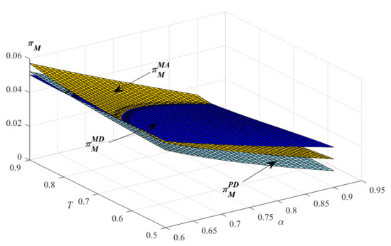 By substituting into , the Hessian matrix of in terms of and is . From the assumption , we have and . If , then we have , then M’s profit is strictly concave with respect to and . If , M can make any positive profit. Therefore, this study only considered the case when to obtain optimal results. It can be obtained from that and .