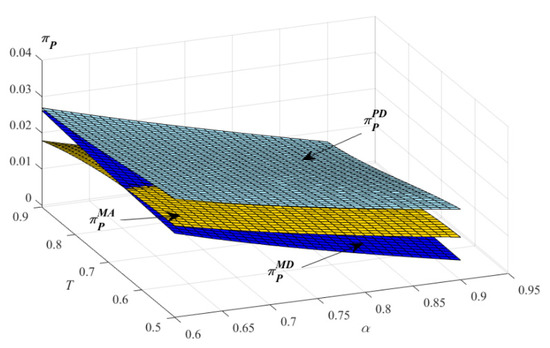 By substituting demands and into the profit functions and , the Hessian matrix of in terms of and is . From the assumption , we have and . If , then we have , then P’s profit is strictly concave with respect to and . If , P can make any positive profit. Therefore, this study only considered the case when to obtain optimal results. Combined with the assumption in the proof of Theorem 1 and the assumption in the proof of Theorem 2, is assumed in this study to obtain optimal results. Under this assumption, is strictly concave with respect to and . It can be obtained from that and .