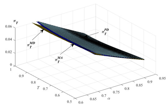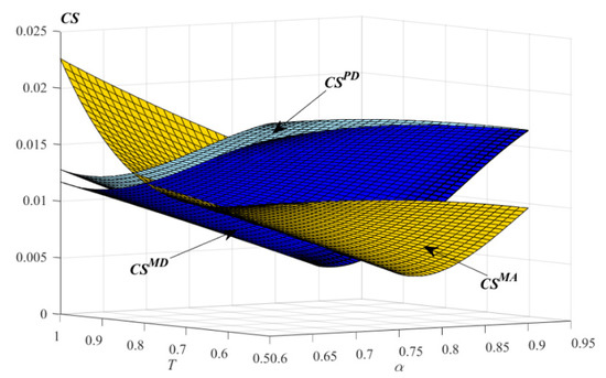 Figure 7 shows that, with the increase in the extended warranty coverage, the consumer surplus in the model firstly decreases and then increases. When the product failure probability is small, with the increase in the extended warranty coverage, the consumer surplus in the models and firstly decreases and then increases. On the other hand, when the product failure probability is large, with the increase in the extended warranty coverage, the consumer surplus in the models and always decreases. That is to say, the high extended warranty coverage is not always beneficial for consumers. Moreover, when the extended warranty coverage is short, the consumer surplus in the model is the highest. On the other hand, when the extended warranty coverage is long, the consumer surplus in the model is the highest. In other words, when the extended warranty coverage is short, the strategy of extended warranty provided and sold by P is beneficial for consumers. On the contrary, the strategy of extended warranty provided by M and sold by P is the best choice for consumers.