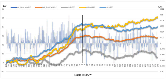where CARi,±240 is the CAR during ±240 days (a total of 481 days) of the individual company i around the event date, and ARi,t is the abnormal return on t days of the individual company i. The reason why we use the event period of ±240 days in this study is that previous studies [1,6,10] have used it relatively recently to analyze the long-term effects of corporate name changes. Figure 1 shows the CAR of our entire sample during ±240 days and also shows the CARs by groups. Referring to Figure 1 below, it can be seen that this period setting well reflects the semi-strong efficient market as an effect on the announcement of the corporate name change. In other words, all the effects are reflected in the market before the announcement date of the change of the company name, and it appears that the effects have not disappeared and have been maintained since the announcement date.
