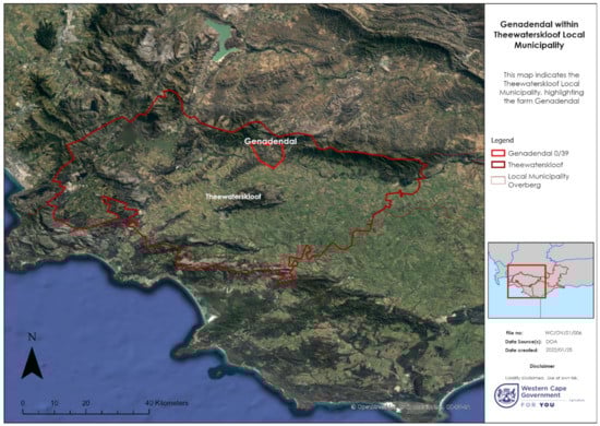 The study was carried out in Genadendal (34.0432 S, 19.5497 E), a small historical town and the oldest Moravian mission station in South Africa [24,45]. The town is situated in the foothills of the Riviersonderend Mountains in the Theewaterskloof Local Municipality, approximately 120 km east of Cape Town (Figure 1).