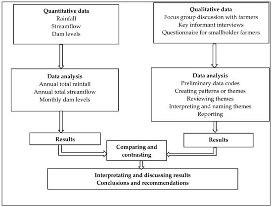 Quantitative data for rainfall, streamflow, and dam water levels from the year 2013 to 2019 were collected from responsible institutions that manage water resources. Rainfall data for the weather station closest to the study area was used because there was no weather station located within Genadendal. However, the weather is within the same catchment area where Genadendal is located; therefore, it closely reflects rainfall conditions in Genadendal. The streamflow of the river and water level of the dam supplying agricultural water to some of the smallholder farmers was used as well. Quantitative data from other streams and irrigation dams were not available due to the unavailability of gauging stations. The main aim of this quantitative data was to check whether there was a reduction in water resources in the study area, especially during the 2015–2018 drought that affected most parts of the Western Cape province. Graphs were plotted and used to analyze the trends or changes in rainfall, streamflow, and dam water levels during the 2013–2019 period.