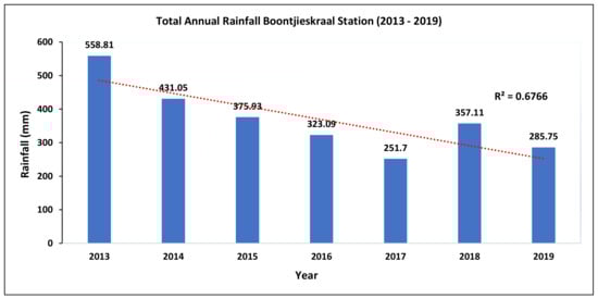 Total annual rainfall at the Boontjieskraal weather station for the period 2013–2019.
