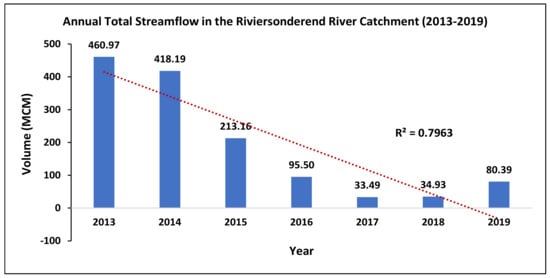 Annual total streamflow in million cubic meters in the Riviersonderend river catchment for the period 2013–2019.