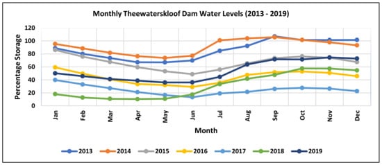 Monthly percentage storage at Theewaterskloof Dam for the period 2013–2019.