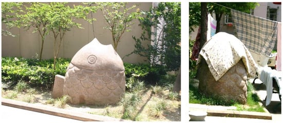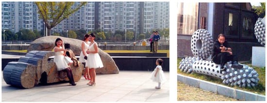Residents challenged the rationale of investing in sculptures instead of other types of amenities (e.g., fitness facilities). People questioned the importance of art to this specific neighborhood compared with its cost, i.e., 400,000–500,000 yuan. Why public art and not athletic amenity provision, e.g., plastic runways, pavilions, fitting facilities, and concern for overspending []? “These sculptures do not appeal to the tastes of the elderly. They should be installed in high-end neighborhoods, not here. The sculptures are impractical, too expensive, less desirable than pavilions” []. Further critics focus on how the art genre and form do not fit into the demographics of this specific neighborhood, a working-class neighborhood of elderly citizens who prefer conventional aesthetic attributes and traditional motifs over contemporary artistic experiments (Chen and Jiang show that fitting facilities achieved the highest scores of awareness, participation, and recognition, 100%, 65%, and 100%, respectively, overpassing seniors’ activity rooms, libraries, and other facilities. Cultural facilities achieved a low participation rate despite a high degree of recognition []). Moreover, “why aren’t the ladies represented in a photorealistic manner? Why are the necks so long?” Eighteen out of twenty respondents, ages 50–80, critically commented on the sculptures []. Another result of the lack of public consultation is the undesirable design of sculpture sites. One respondent, for instance, called for outdoor furniture or fitting facilities that go with the artworks [] (Figure 2).