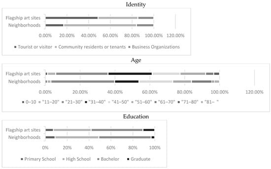 Demographic profiles of subjects (identity, age, education, sex) in two broad categories—prominent public venues in city centers (for flagship art site) and neighborhoods—are listed in Scheme 1. While the correlation of the variables “age”, “education”, and “sex” to public art reception is debated, “familiarity of artworks” and “social and symbolic proximity to artworks” have been verified to be positively correlated to public art reception []. This research therefore distinguishes “residents” from “local businesses” and “visitors” (Visitors are limited to Shanghai residents who do not reside in the neighborhoods of the sampled public art sites). “Residents” are assumed to possess a higher degree of “familiarity of artworks” as well as social and symbolic proximity to artworks. “Local businesses” are familiar with artworks but have lower social and symbolic proximity to artworks. Presumably, “visitors” underperform in all three aspects. Flagship art localities are logically exposed to a higher percentage of visitors.