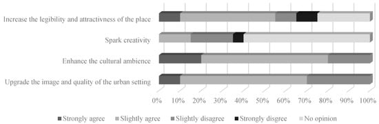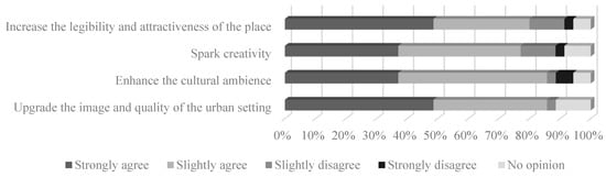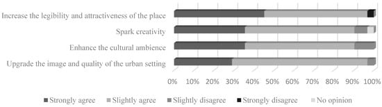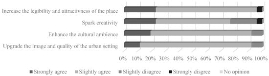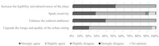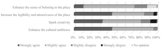 According to the statistical data, 88–100% of the respondents acclaim the artworks on the four indicators. In particular, 52% of the respondents strongly agree that these artworks “increase the legibility and attractiveness of the place” (Scheme 3).