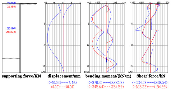 - —Passive earth pressure and fulcrum force to the bending moment of the pile bottom; the fulcrum force in this paper takes the smaller value of the anchoring force and the tensile force of the anchor;