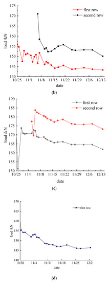 - The axial force of prestressed anchor varied with the formation pressure and surrounding load. The tension of the lower anchor had a certain influence on the axial force of the upper anchor. Except for the east side of the foundation pit, the anchors of the first layer were all stabilized at about 140 kN, and the anchors of the second layer were stabilized at about 150 kN. The third row of anchors on the north side was stable at around 170 kN.