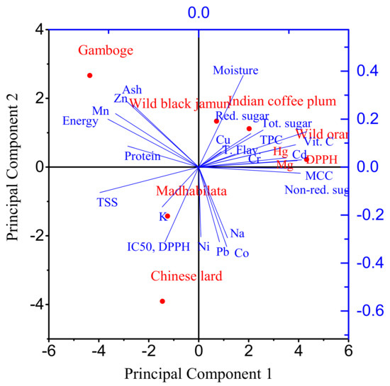 In the PCA of 26 variables, five principal components (PCs) were extracted with an eigen value of >0.9 and this explained 100% of the variance in the data (Table S2). Total sugar, reducing sugar, and Cd were the highly weighted variables in PC1. In PC2, ash, Zn, and Mn were the highly weighted variables. In PC3, Co was the highly weighted variable, whereas Cu, Hg, and metal chelating capacity were the highly weighted variables in PC4. In PC5, Ni was the highly weighted variable. To avoid redundancy, total sugar was selected from PC1 as the key indicator. Cd and reducing sugar were dropped. Among the other PCs, based on importance, Zn, Mn, and Cu were selected. Therefore, total sugar, Zn, Mn, and Cu were the key indicators identified and should be given importance while studying the nutritional value of these wild fruits. Figure 1 shows the bi-plot of PC1 vs. PC2 for all the variables analyzed in six fruit samples. The loading plot describes the impact of variables and correlation, i.e., closeness of angles. The observation data refers that Cr, Cu, Hg, K, Cd, and Mg are correlated with each other in Indian coffee and Wild orange. These nutrients showed a positive direction of PC1 and PC2, suggesting that Cr, Cu, Hg, K, Cd, and Mg nutrients are rich in Indian coffee and Wild orange. The Ni, Co, and Pb lie in the positive direction of PC1, referring to Madhabilata and Chinese lard which are a rich source of these elements. Total and reducing sugar, Vitamin C, and moisture are trending in the positive direction of PC1 and PC2, illustrating that enrichment to wild orange and wild black Jamun are highly correlated. The Gamboge is a protein-rich and energetic fruit.