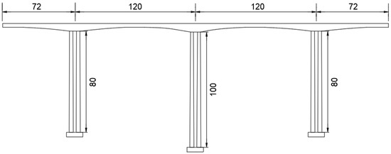 A 72 + 120 + 120 + 72 m continuous rigid frame bridge on the highway from Longshan to Yongshun in Hunan Province, China has been taken as the research object. This bridge was chosen as the object of this study for two reasons: (1) this bridge is located in southern China, i.e., a mountainous region where rockfall disasters happen frequently; (2) continuous rigid frame bridges with a highest pier height of approximately 100 m are normally chosen as the research prototype [15,16]. The bridge layout is shown in Figure 2. The cross-section of the bridge pier comprises a single box and a single chamber section. The superstructure of the bridge is supported by HTWBPs; the middle pier is 100 m high and the side pier is 80 m high. Based on a continuous rigid-frame bridge, a geometric model is established using the HyperMesh program (www.altair.com), as shown in Figure 3. The size of rockfall is widely distributed. As reported by a previous study [1], the diameter of rockfalls is normally 1.5 m to 2.5 m; three rockfall models with different diameters, i.e., 1.5 m, 2.0 m, and 2.5 m, are established in this research.
