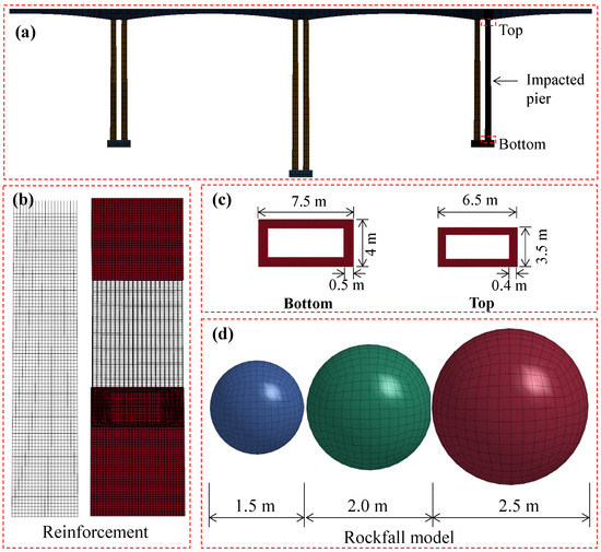 FE model of the bridge and rockfall. (a) bridge; (b) reinforcement; (c) cross-section; (d) rockfalls.
