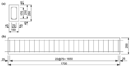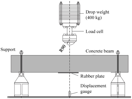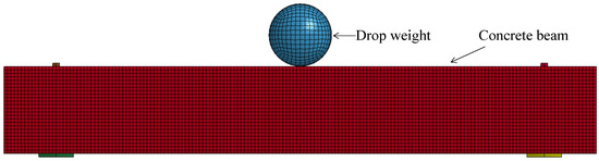 This material model and contact algorithm of the rock-HTWBP model are verified, based on the drop-weight test of a reinforced concrete beam performed by Fujikake et al. [23]. As shown in Figure 5, the test drops a weight of 400 kg from four different heights on the middle of the span of concrete reinforced beams. The lower part of the drop hammer has a hemispherical tip with a radius of 90 mm. In the test, the concrete reinforced beam has a rectangular cross-section of 150 × 250 mm, the length of the beam is 1700 mm, and the uniaxial compressive strength of the concrete is 42 MPa. The diameters of the longitudinal reinforcement of the three tests are 16, 22, and 22 mm with yield strengths of 397, 426, and 418 MPa, respectively. The diameter of the transverse reinforcement is 10 mm with a spacing of 75 mm, and the yield strength is 295 MPa. The reinforcement is shown in Figure 6. One of the reinforcement conditions is selected for verification; that is, the longitudinal reinforcement diameter is 16 mm, the longitudinal reinforcement ratio is 1.26%, and the impact height of the drop hammer is 0.15 m, 0.3 m, 0.6 m, and 1.2 m. Figure 7 shows the FE model that was established, based on the above tests. The material models and contact algorithm are consistent with Section 2.1 and Section 2.2.