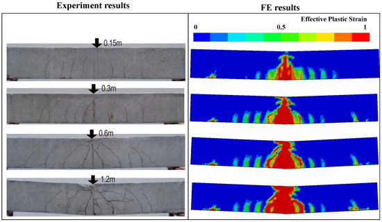 Figure 8 compares the damage between the experiment and FE analysis at different impact heights. As shown in the figure, at different impact heights, the concrete beam in the experiment and FE analysis exhibits overall flexural failure, and bending cracks appear on the lower side. Moreover, when the height of the drop weight is 1.2 m, it is observed that serious local damage occurs at all loading positions. The damage mode obtained in the FE model is in good agreement with the damage phenomenon observed in the impact experiment, which indicates that the FE model can accurately simulate the damage of the concrete beam under the impact load.