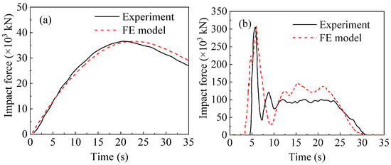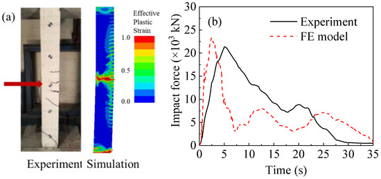 A 1:1 FE model is established according to the details of the experiment. Figure 11 shows the comparison between the experiment in [24] and the FE analysis. As shown in Figure 11a, the damage pattern of the experiment and simulation is similar. Specifically, the simulation well captures the flexural and shear cracks. As shown in Figure 11b, the impact force undergoes a similar up-down process in both the experiment and simulation. Although the two curve shapes show a moderate difference, the peak impact forces are close. The error of the simulation is only 9.3%, which is acceptable when considering an engineering problem. Hence, the verification process further proves that the FE models established in this research are reliable.