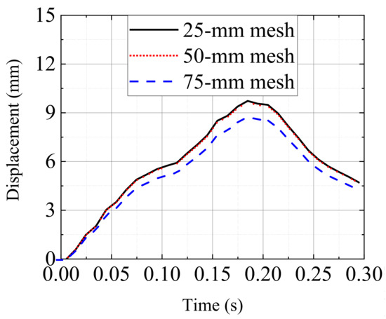 To verify the rationality of the mesh size for the impacted pier, a grid independence verification is conducted. Three mesh sizes, i.e., 25, 50, and 75 mm, are adopted to mesh the impacted pier. Figure 12 compares the mid-span displacement of the impacted under three mesh sizes. As shown in Figure 12, the results obtained by the 25-mm mesh and 50-mm mesh are consistent with only a 1% difference observed. However, the displacement calculated by the 75-mm mesh shows a large difference between 25-mm and 50-mm meshes. Hence, it is believed that the 75-mm mesh is too large to simulate the impact behavior of the HTWBP. To balance the accuracy and computational efficiency, adopting the 50-mm mesh for the impacted pier is reasonable.