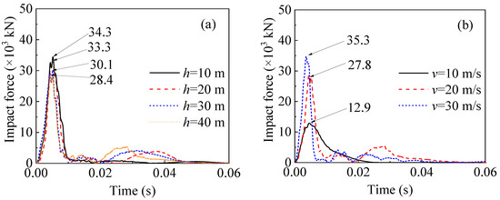 As shown in Figure 13a, when the impact height is 10, 20, 30, and 40 m, the peak impact force is 34.8 × 103 kN, 33.4 × 103 kN, 31.3 × 103 kN, and 29.4 × 103 kN, respectively. When the impact height increases from 10 m to 40 m, the peak impact force decreases by 15.5%. The possible reason for this phenomenon is that when the impact position is closer to the pile cap, the pier is constrained more strongly, and the corresponding peak impact force is larger. As shown in Figure 11b–d, the peak impact force increases with the increase in impact velocity, rockfall diameter, and concrete strength. When the impact velocity increases from 10 m/s to 30 m/s, the peak impact force increases by 170.1%. When the rockfall diameter increases from 1.5 m to 4.0 m, the peak impact force increases by 100.0%. This is because the larger the velocity and diameter of the rockfall, the larger the corresponding kinetic energy, leading to an increase in the impact force. When the concrete strength grade increases from 30 MPa to 50 MPa, the peak impact force only increases by approximately 5%. This indicates that the impact force mainly depends on the stiffness of the rockfall, while the stiffness of the bridge pier plays a secondary role, which is consistent with the research results reported in [1].