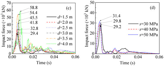 Impact force of rockfall-HTWBP impact. (a) impact height; (b) impact velocity; (c) rockfall diameter; (d) strength grade.