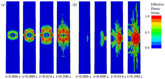 As shown in Figure 14a, when the HTWBP is impacted by a rockfall, the elliptical damage centered on the rockfall appears on the impacted surface of the pier, while the damage degree gradually deepens and spreads along the pier vertically and toward the pier edge. When t = 0.006 s, that is, after the impact force reaches the peak, the damage degree is relatively light. When t = 0.008 s, the damage degree gradually deepens, and the damage area spreads both vertically and to the edge of the bridge pier. There are conical and strip damage areas at the edge of the pier and the vertical center line of the pier, respectively, which may be caused by the weak transverse flexural bearing capacity of the impacted surface of the hollow pier. As the impact process continues, the conical and strip damage areas further extend, and the degree of damage gradually enlarges. At the same time, the damage area of the impacted surface gradually develops into the final elliptic damage pattern, with the conical and strip damage areas as the symmetry axis. In addition, the time of impact force is about t = 0.005 s, while the damage process of the bridge pier mainly occurs from t = 0.006 s to t = 0.300 s. This phenomenon shows that the bridge pier has a lag effect on the dissipation of the impact energy, so it takes a certain time for the kinetic energy to be converted into internal energy after the rockfall impact.