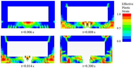 An element killing algorithm (*MAT_ADD_EROSION) in LS-DYNA is used to simulate the damage of bridge piers impacted by rockfalls [25]. To bring the FE simulation result close to the actual impact result, the maximum principal strain of 0.1 is set as the condition of mesh killing. Figure 14 shows the damage process of the impacted surface and side surface of the pier when h = 40 m (Case C1). Figure 15 shows the damage process of the mid-height cross-section.