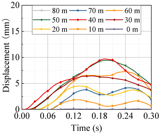 Figure 16 shows the displacement time history curves of each cross-section of the pier when the impact height h = 40 m, where 0 m is the pier bottom and 80 m is the pier top. After the impact, the displacement of the impacted cross-section (40 m) first increases, and then the stress wave propagates up and down from the impact position at the same speed, so the displacement of 30 m and 50 m cross-sections almost increased at the same time. It can also be found that the initial growth rate of displacement of 30 m and 50 m cross-sections is basically the same. The same phenomenon is also observed in 20-m and 60-m cross-sections and 10-m and 70-m cross-sections. The maximum displacement of the nine sections is 9.77 mm, which appears at the impacted cross-section. The maximum displacement appears at a 40-m height because the superstructure’s gravity exerts a strong constraint on the pier top. In other words, when the pier top tries to move, it must resist the huge inertial force of the superstructure.