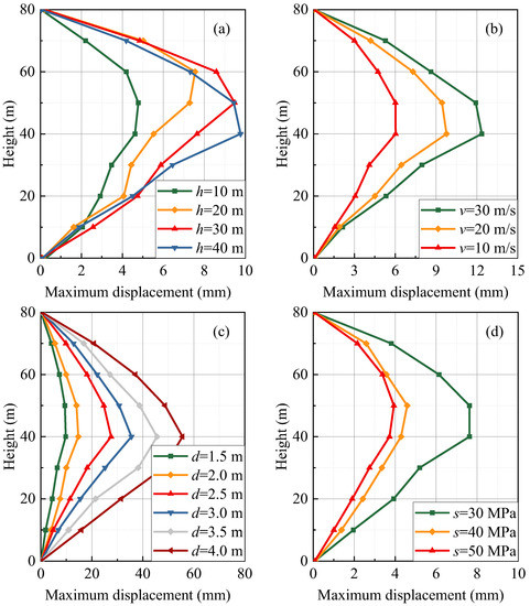 As shown in Figure 17, the maximum displacement increases with impact height, impact velocity, and rockfall diameter. The maximum displacement of the bridge pier decreases with the increase in concrete strength. As shown in Figure 17a, the maximum displacement is 4.8, 7.6, 9.5, and 9.8 mm when the impact height is 10, 20, 30, and 40 m, respectively. When the impact height rises from 10 m to 40 m, the maximum displacement increases by 104.2%. This is due to the fact that the closer the impact position is to the pier top, the weaker the cross-section and, therefore, the greater the displacement. As shown in Figure 17b, when the initial impact velocity of the rockfall is 30, 20, and 10 m/s, the maximum displacement is 12.37 mm, 9.77 mm, and 6.03 mm, respectively. When the initial impact velocity of the rockfall increases from 10 to 30 m/s, the maximum displacements increase by 100.3%. As shown in Figure 17c, when the diameter of the rockfall is 1.5, 2.0 m, 2.5 m, 3.0 m, 3.5 m, and 4.0 m, the maximum displacements are 9.77, 14.7, 27.58, 35.5, 44.7, and 56.1 mm, respectively. When the diameter of the rockfall increases from 1.5 m to 4.0 m, the maximum displacement of the bridge piers increases by 474.2%. The rockfall diameter has a significant influence on the displacement of the bridge pier. When the rockfall diameter increases, the deformation of the bridge pier increases. As shown in Figure 17d, when the bridge pier concrete strength grades are 30, 40, and 50 MPa, the maximum displacements are 7.6, 4.2, and 3.9 mm, respectively. When the concrete strength grade increases from 30 to 40 MPa, the maximum displacement decreases by 44.7%. When the concrete strength grade increases from 40 to 50 MPa, the maximum displacement decreases by 7.1%. This indicates that the improvement of concrete strength grade can effectively increase the impact resistance because of the improvement in pier stiffness.