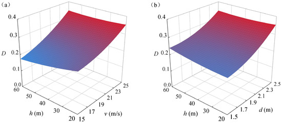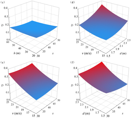 Figure 18 shows the damage response surfaces with different parameters, obtained from the response surface model expressed in Equation (13). In each subfigure, the influence of two parameters is presented and other parameters are fixed at level 0, as listed in Table 5. As shown in Figure 18, different parameters have dissimilar effects on the damage indices when they are impacted by rockfalls. As shown in Figure 18a,b, with the increase in the initial impact velocity and rockfall diameter, the damage factor increases significantly, and the influence of the initial impact velocity and rockfall diameter is greater than the impact height. As shown in Figure 18c, with the increase in the impact height and concrete strength, the damage factor of the HTWBP slightly changes. As shown in Figure 18e,f, the damage factor increases significantly with the increase in the initial impact velocity and diameter of rockfall, which is more significant than that of the concrete strength. It can be seen from the six response surfaces in Figure 18 that the initial impact velocity and diameter of the rockfall are the most significant parameters affecting the damage indices, followed by the impact height and concrete strength, i.e., .