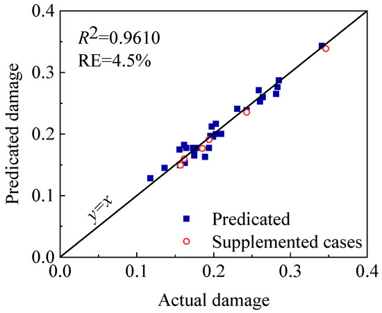 Six FE models are supplemented to further verify the accuracy of the established response surface model, as listed in Table 7. The damage index, calculated by using the FE model and predicted by the RSM, is also compared in Table 7 and Figure 19. The determination coefficient, R2, and relative error (RE) are used to evaluate the accuracy of the model. As listed in Table 7 and shown in Figure 19, the maximum difference between the FE model and predicated by the RSM is only 4.8%. The determination coefficient R2 value is 0.9610, which is close to 1.0, and the average RE is only 4.5%. Therefore, the response surface model established expressed in Equation (13) shows high competence in predicting the damage of HTWBP after rockfall impact.