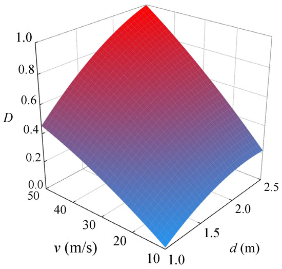 The impact height is set at 40 m, and the strength grade is set at 30 MPa. Table 8 shows the factors and levels of the central composite design in this section. According to the central composite design in Table 8, corresponding cases and damage results are listed in Table 9. According to the damage results in Table 9, the response surface function can be expressed as Equation (14). Figure 20 shows the response surface of the damage index under different impact velocities and rockfall diameters. As shown in Figure 20, the damage index significantly increases with the increase in impact velocity and rockfall diameter. This phenomenon is consistent with the aforementioned results.