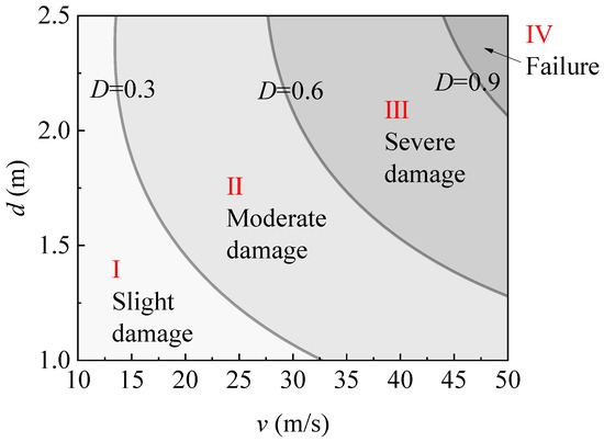 The damage index of the HTWBP under rockfall impact is divided into four levels, with 0.3, 0.6, and 0.9 as the critical value of damage, respectively. Figure 21 shows the damage zoning diagram obtained according to Equation (14), where the ordinate is the rockfall diameter and the abscissa is the impact velocity of rockfall. As shown in the figure, three damage assessment curves divide the area into four parts: a slight damage area (), a moderate damage area (), a severe damage area (), and a failure area (). With the damage zoning diagram, a fast assessment of the damage level of impacted HTWBP can be realized, according to rockfall diameter and velocity after rockfall impact.