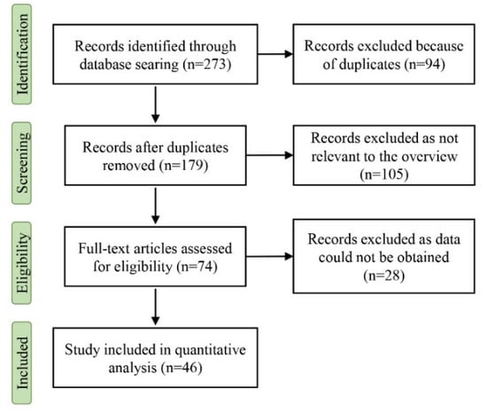 The literature focused on the “straw decomposition of wheat and maize in China” from sources such as CNKI (https://www.cnki.net/, accessed on 30 March 2022) and Web of Science (http://wokinfo.com/, accessed on 30 March 2022) core collection databases were collected. The search terms were “straw decomposition rate,” “maize,” “wheat,” and “China” in Chinese or English from January 1990 to March 2022. The search strategy identified a total of 273 articles (Figure 1). Irrelevant and duplicate publications were eliminated by reviewing the titles and contents of the publications manually. This yielded 46 articles that underwent full-text analysis. The publications included in our dataset had to meet the following criteria: