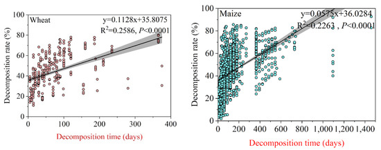 During the 1460 days of the study, the decomposition rate of maize straw ranged from 1.86% to 92.72%, with a median of 45.24% (Figure 2). In 81.1% of studies, the study period of maize straw decomposition concentrated in 180 days, and the decomposition rate was from 1.86% to 85.61%, with a median of 40.39%. Additionally, the rapid decomposition period was from 0 to 60 days, with an average straw decomposition rate of 31.80%. Regression analysis shows that the decomposition rate of maize straw was directly proportional to the decomposition time (y = 0.0575x + 36.0284, R2 = 0.2263, p < 0.0001).