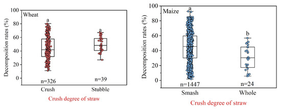 The decomposition rate of crushed wheat straw was 11.12–80.33% with a median of 41.85%, while the straw decomposition rate with stubble straw was 1.86–92.97% with a median of 46.90% (Figure 3). However, there was no significant difference between these two methods of straw return on the decomposition rate. For maize straw, the decomposition rate with crushed straw was 1.86–92.72% with a median of 45.58%, and those with whole straw were 5.84–56.82% with a median of 30.37%. Furthermore, a significant difference analysis illustrated that the decomposition rate of crushed maize straw was significantly increased compared with whole straw.