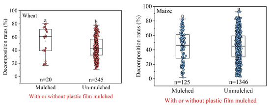 Additionally, there was a significant difference between the mulched and un-mulched states of straw in terms of the decomposition rate of wheat straw. Under the former treatment, the decomposition rate of wheat straw was 17.00–80.33% with a median of 60.63%, and that under the latter treatment was 11.2–78.06% with a median of 42.27%. However, there was no significant difference in the decomposition rate of maize straw between being mulched and not (Figure 4).