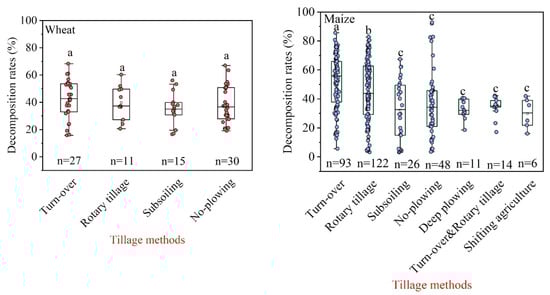 For wheat straw return, no-plowing and turn-over are essential measures. The average decomposition rates of turn-over, rotary tillage, subsoiling and no-plowing were 42.74%, 37.27%, 36.63%, and 35.03%, respectively. However, there was not a significant difference among these four tillage measures in the decomposition rate of wheat straw. For maize straw return, there were seven types of tillage measures, among which turn-over and rotary tillage were important. The sequence of the straw decomposition rate was turn-over (52.20%) > rotary tillage (45.36%) > no-plowing (36.24%) > turn-over rotary tillage (34.43%) > deep plowing (32.80%) > subsoiling (32.22%) > shifting agriculture (29.93%). Significant difference analysis showed that the tillage measures significantly affected the decomposition rate of maize straw, and the straw decomposition rate in the turn-over and rotary tillage modes was significantly higher than that of the others (Figure 5).