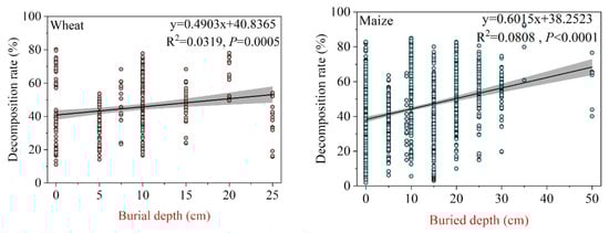 Relationship between decomposition rate of wheat or maize straw and burial depth.