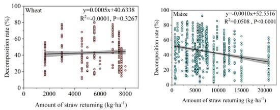 Relationship between decomposition rate and the amount of straw return of wheat or maize straw.
