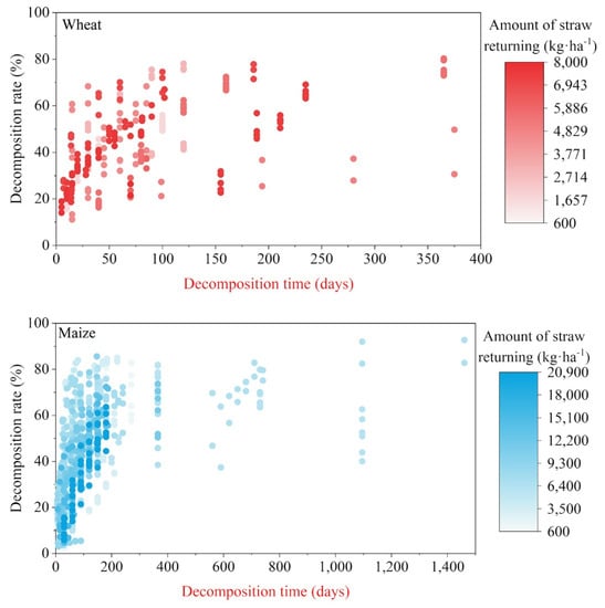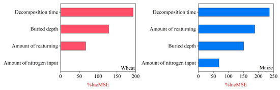 A random forest analysis identified decomposition time as the most important predictor of straw decomposition rates for wheat and maize, especially for the latter (Figure 12). Straw decomposition takes time, and so does the growth of microorganisms. The decomposition of straw can promote an increase in the number of microorganisms, and the growth of microorganisms can also promote straw decomposition in turn [46]. China has successfully explored and proposed the localization of foreign conservation tillage technologies in a single cropping system [47]. However, in the wheat-maize double cropping system, research on agronomic measures and products in straw decomposition should be accelerated, such as the development of straw-decomposing agents and the development of farming machinery in line with China’s national conditions [48]. In addition, the amount of straw return was found to be a secondary factor affecting maize straw decomposition with random forest analysis. A higher amount of straw return can not only unbalance the soil carbon-nitrogen ratio but also reduce the growth of microorganisms if the soil is deficient in nitrogen, affecting straw decomposition rates [49,50]. Additionally, Xu et al. [51] found that the larger the amount of straw return, the higher the concentration of various organic acids and CO2 accumulated in a short period of time and the greater the harmful impact on the growth of the next crop. There is, therefore, a pressing need for the effects of the amount of maize straw return on the decomposition rate, crop yield and agricultural eco-environmental problems.